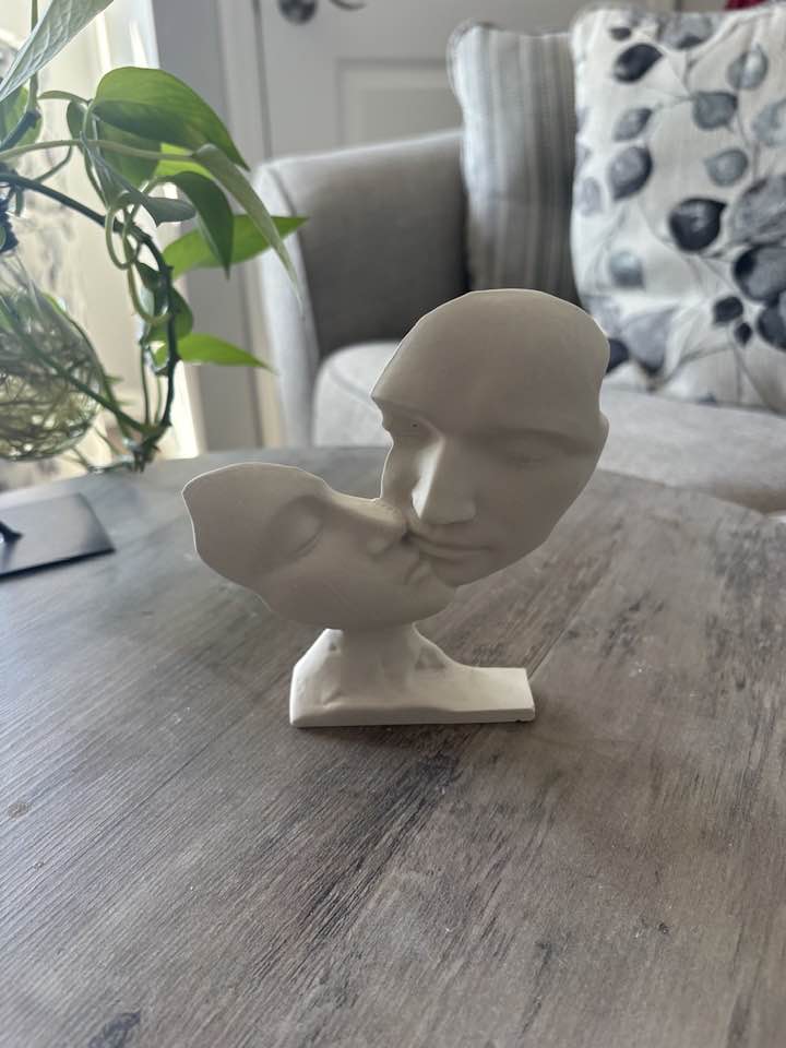 Elegant and thought-provoking sculpture of two abstract faces merging in a soft, intimate moment. Its smooth white finish and modern design make it a striking accent piece for any room.