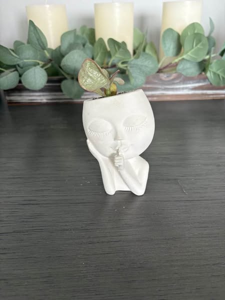Whimsical small pot with a whispering girl motif, adding charm to succulents or artificial plants.
